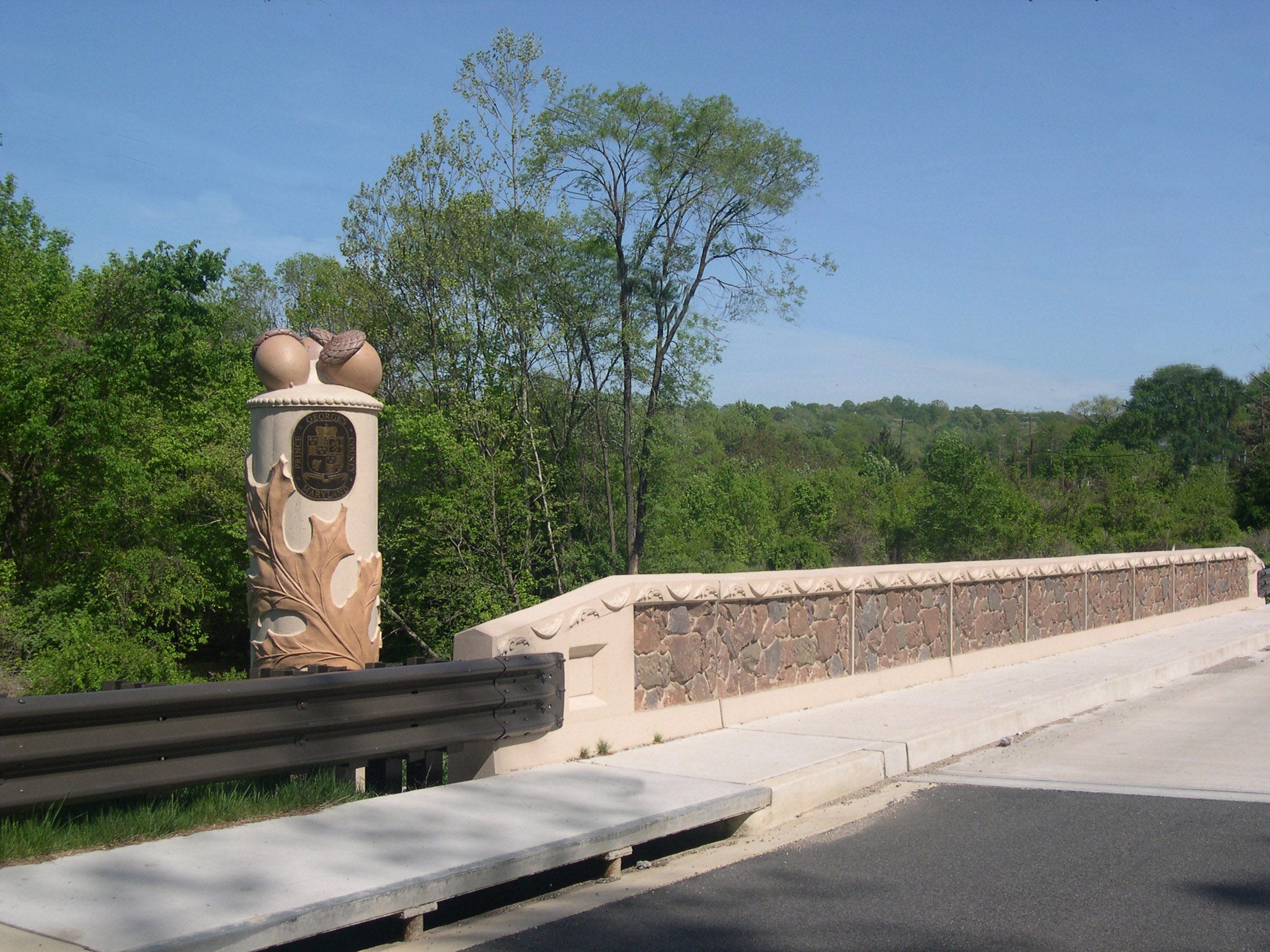 The 23rd Street Parkway Bridge, which marks the gateway between Washington, D.C., and Prince George’s County, celebrates the white oak—the state tree of Maryland. This striking vehicular and pedestrian bridge includes two 150-foot cast-in-place parapet walls and two 6-foot cast-in-place concrete columns. Each column features a white oak leaf in 2-inch raised relief and is capped with a heroic-scale white oak acorn.