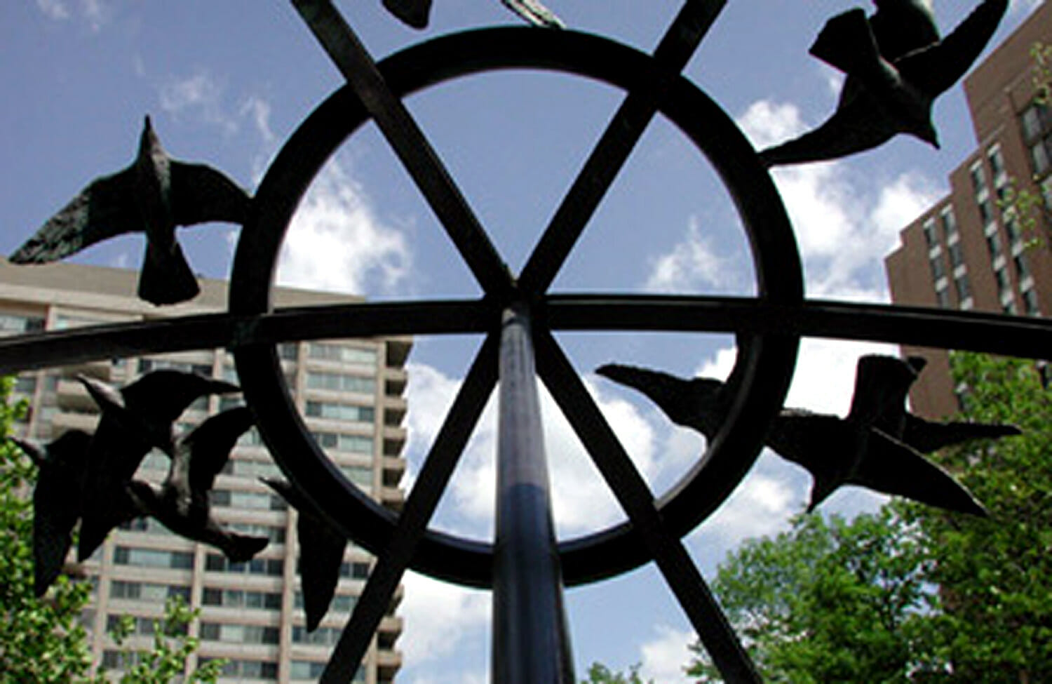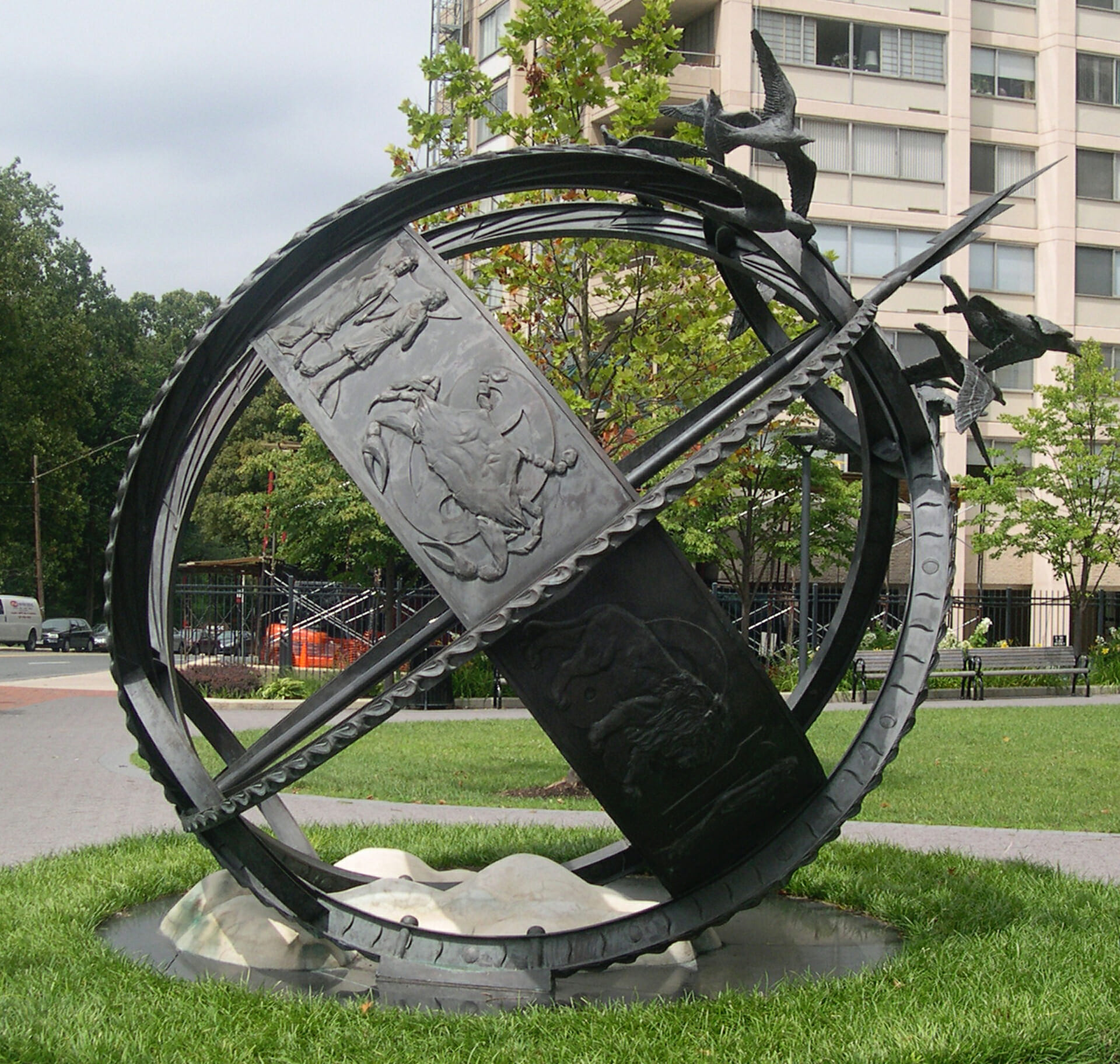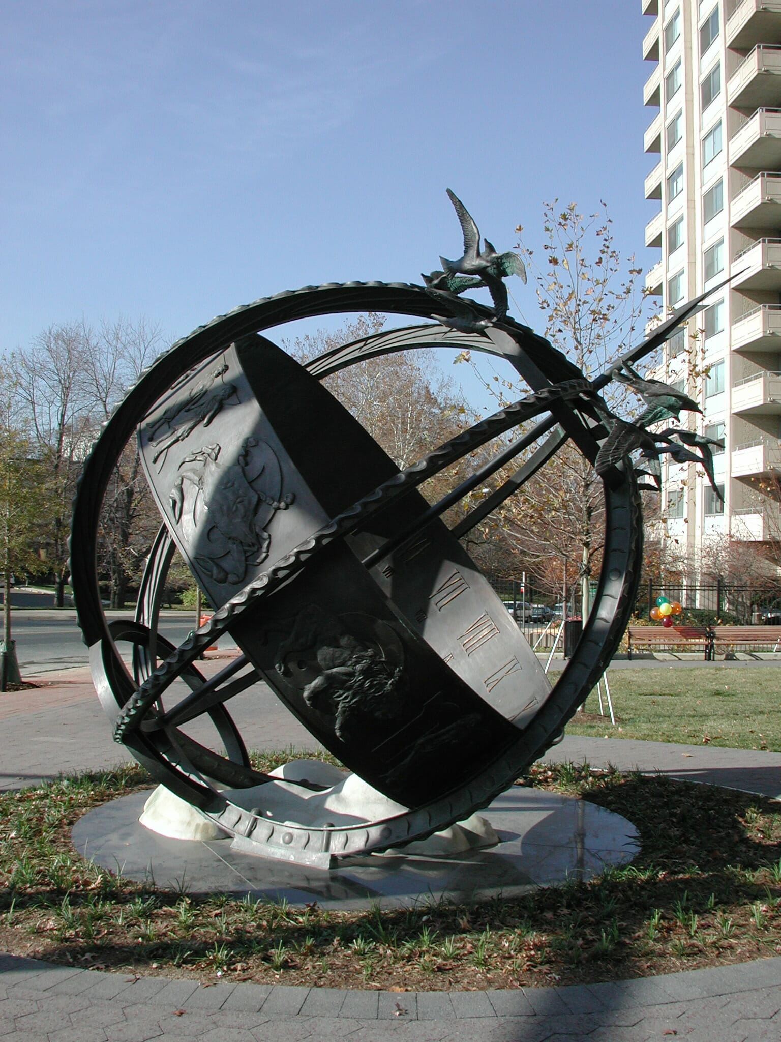 This interactive urban environment is comprised of three main components: 1) a 34-foot clock fountain that refers to future time, 2) a 14-foot bronze Armillary Sphere that alludes to ancient time, and 3) FOTERA concrete sidewalk bands and text panels that reflect on the ephemeral nature of time.