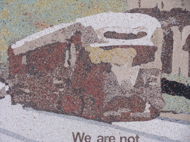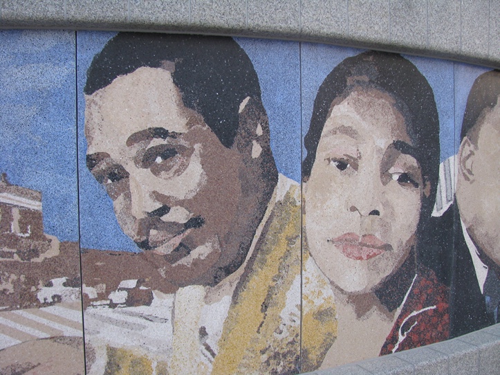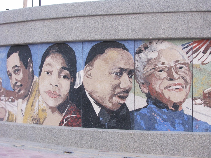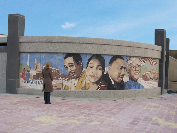 The Cornerstones of History mural depicts important activists, artists, and symbols that were instrumental in transforming the social fabric of Northeast Washington, D.C. Installed as part of a fountain at a key intersection, this FŌTERA® concrete terrazzo artwork reveals four monumental portraits as viewers draw nearer—Duke Ellington, Bessie Smith, Dr. Martin Luther King Jr., and Rosa Parks. Set into a gently curved wall, the figures seem to emerge from the surface, their presence dynamic and immediate. When the fountain is active, water flows on either side of the mural, a visual reminder that these individuals represent both change and renewal.