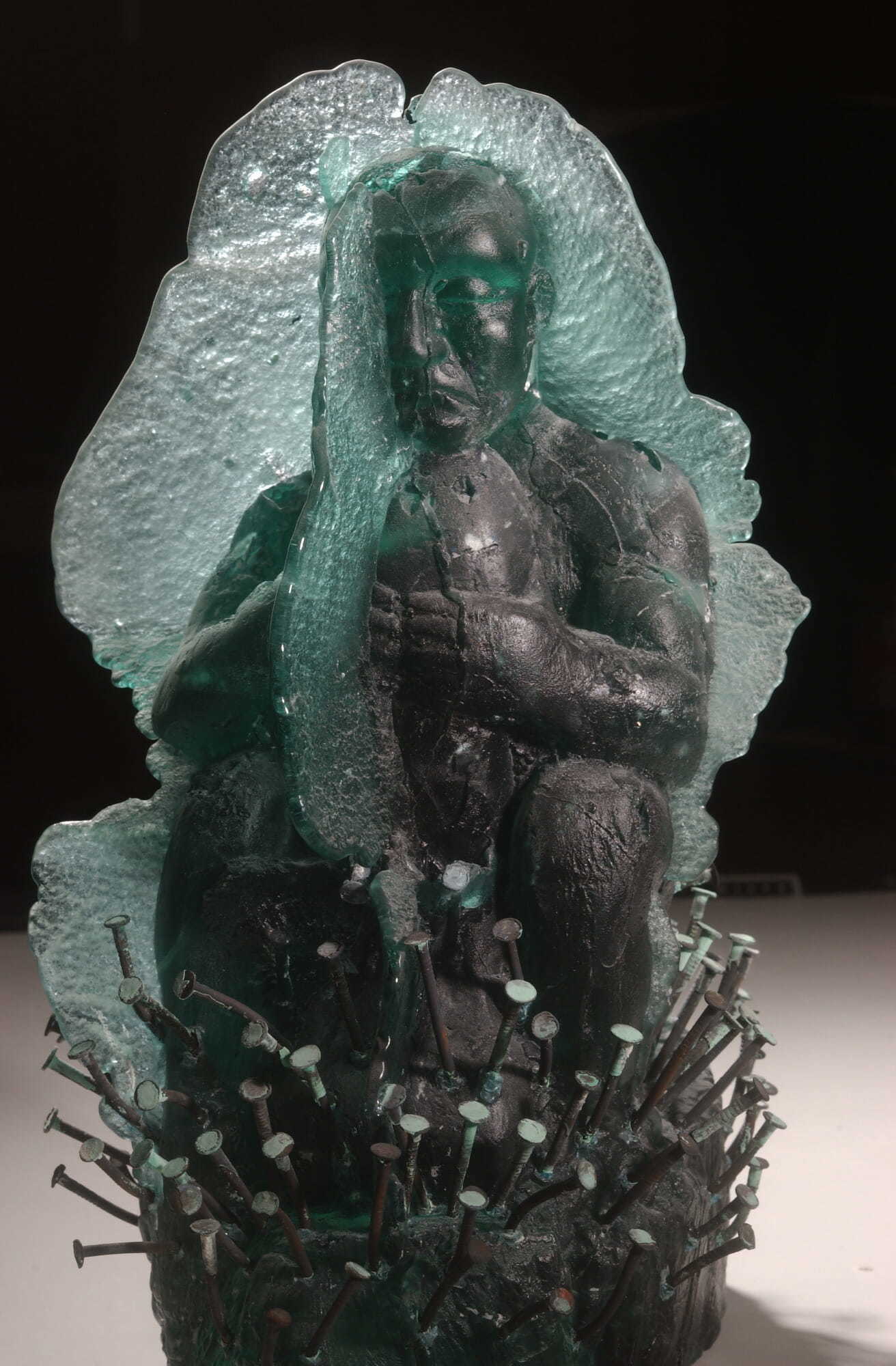 This sculpture combines glass and copper nails to explore themes of ritual and transformation, evoking the essence of traditional fetish objects.