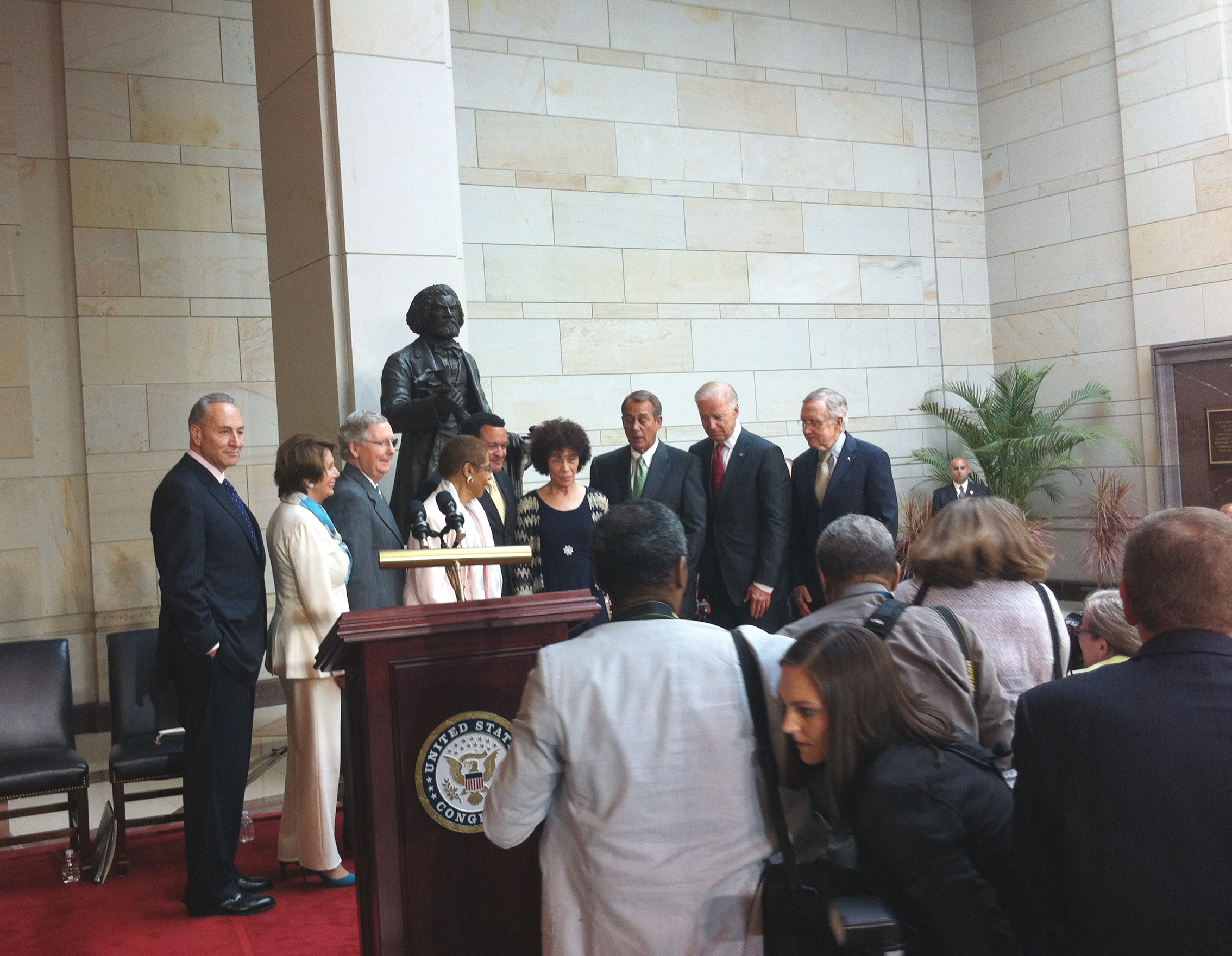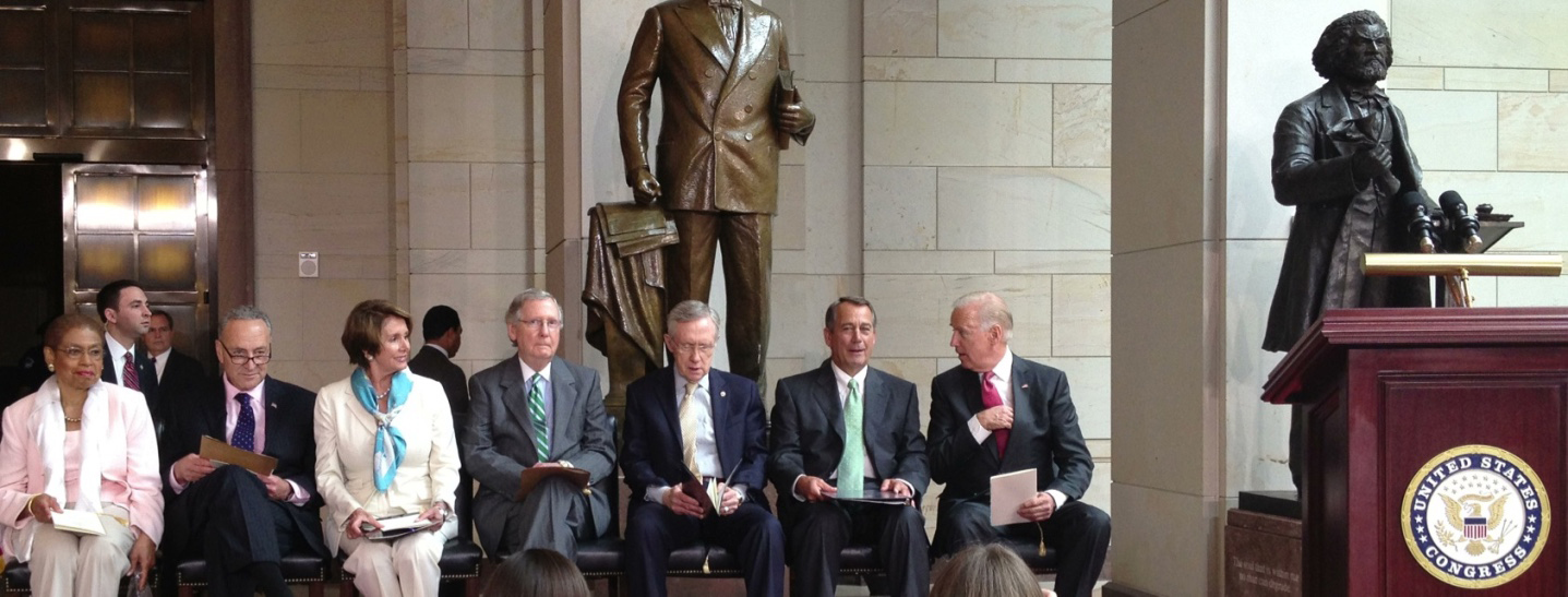 The sculpture was commissioned by the DC Commission on the Arts & Humanities. It took a constitutional amendment, passed by both houses of Congress, and Presidential Signature, to allow the District of Columbia to place the statue of Frederick Douglass in the US Capitol. The dedication ceremony was officiated by then Vice President Joe Biden and House Speaker John Boehner. Also in attendance were Senators Chuck Schumer, Harry Reid, Mitch McConnell, Nancy Pelosi, and Congresswoman Eleanor Holmes-Norton.