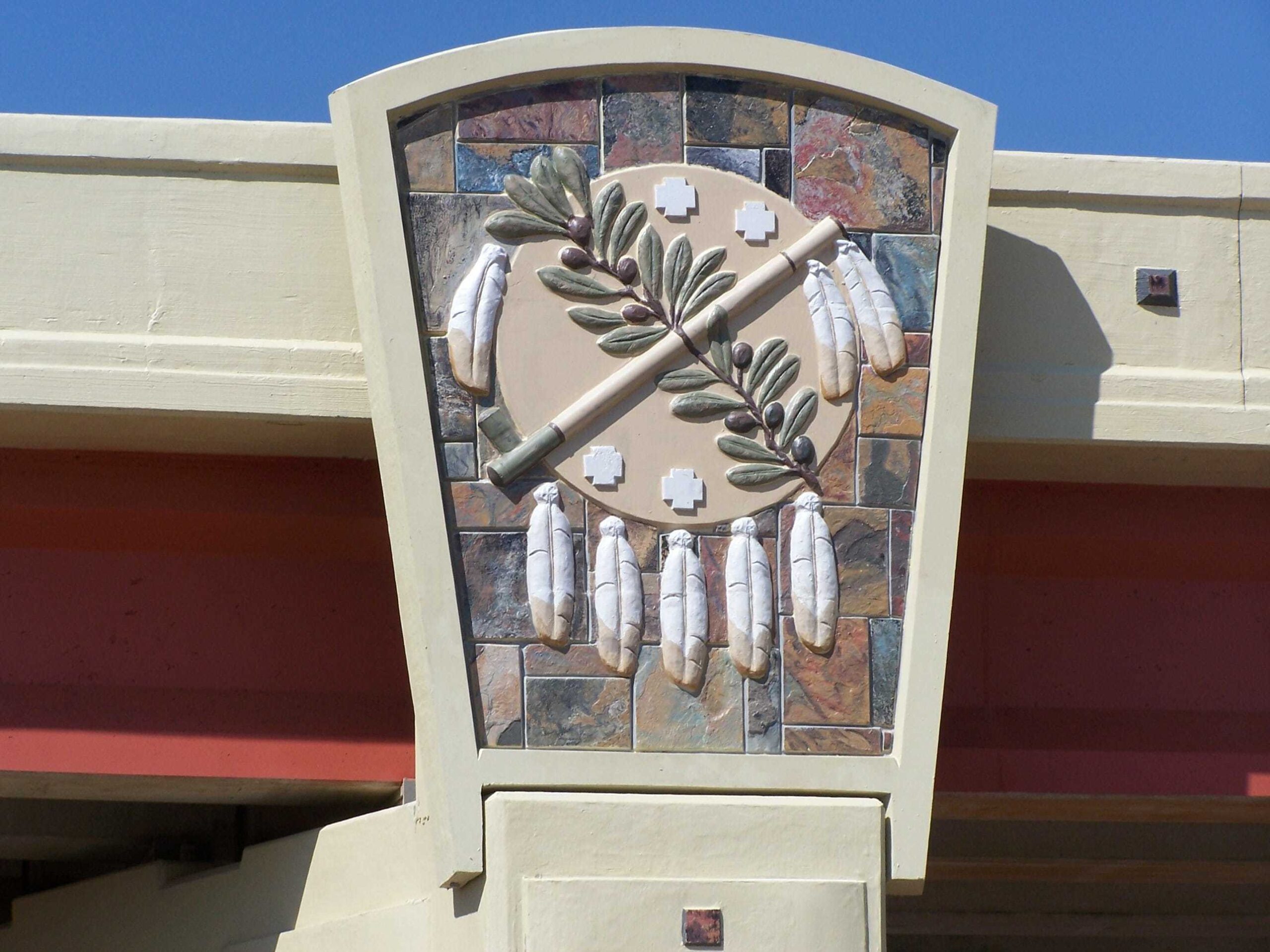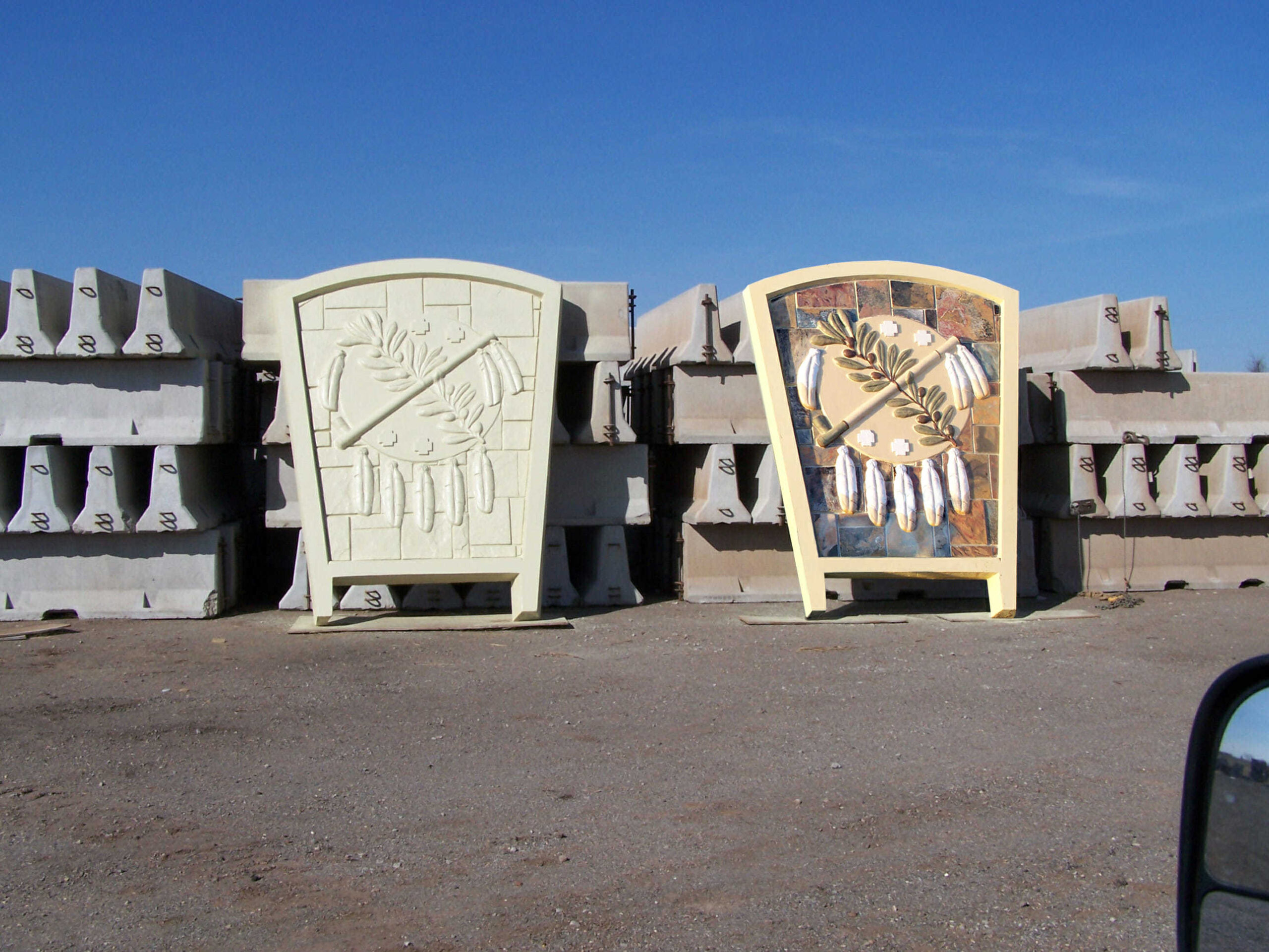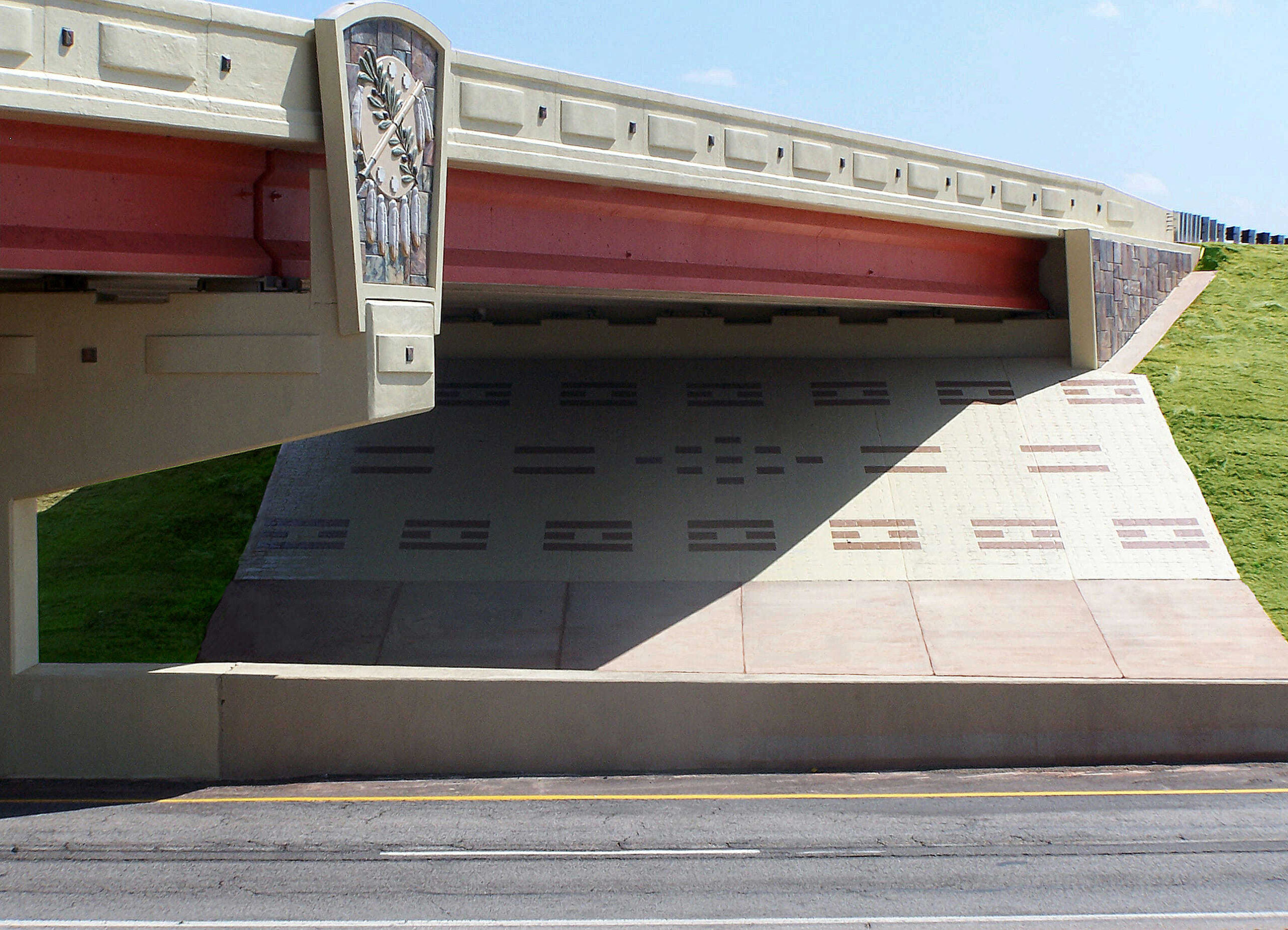 At the center of the bridge, a dynamic shield element—resembling a belt buckle—resolves into the emblem featured on the Oklahoma state flag. Passing beneath the span, travelers see the woven motif wrap around the top of the pier and an interlaced basket pattern stamped into the embankment, reinforcing the theme of craft and cultural heritage.