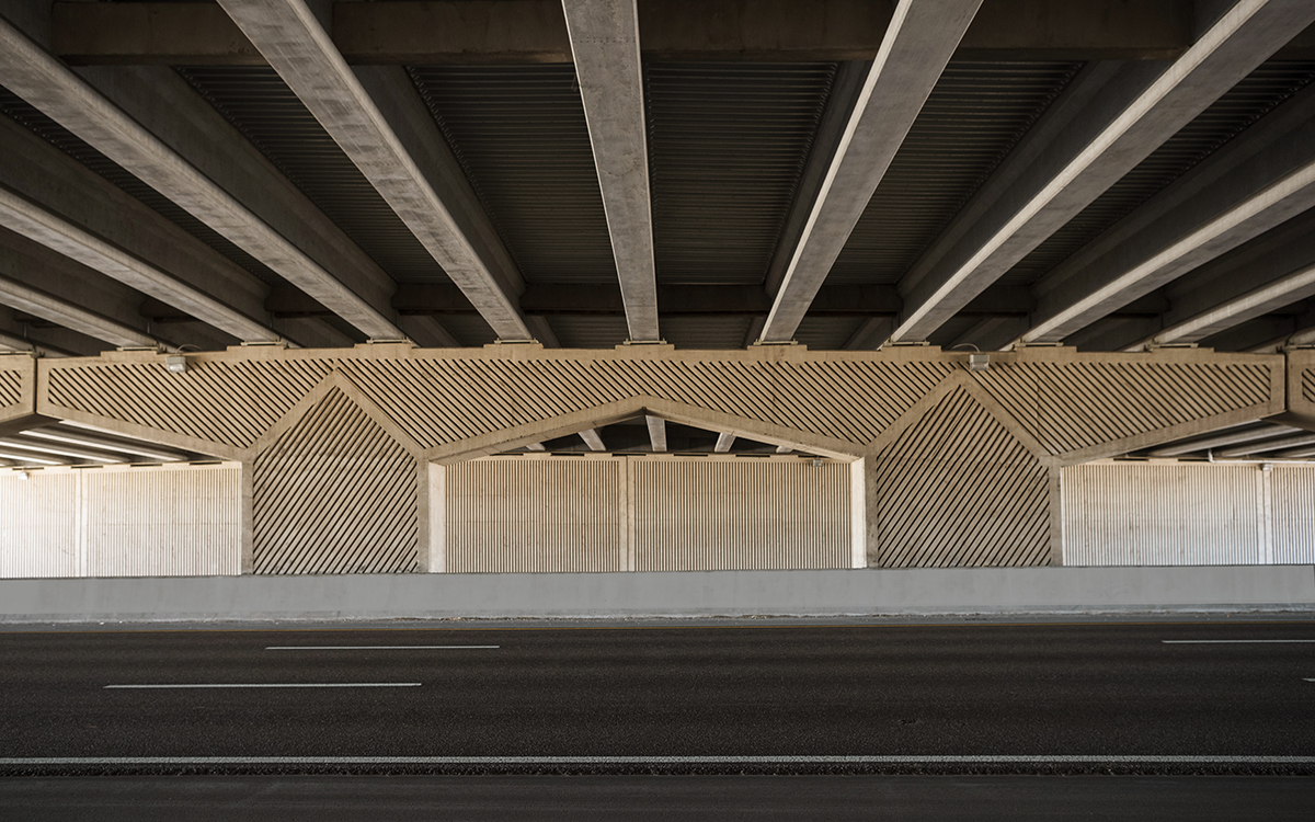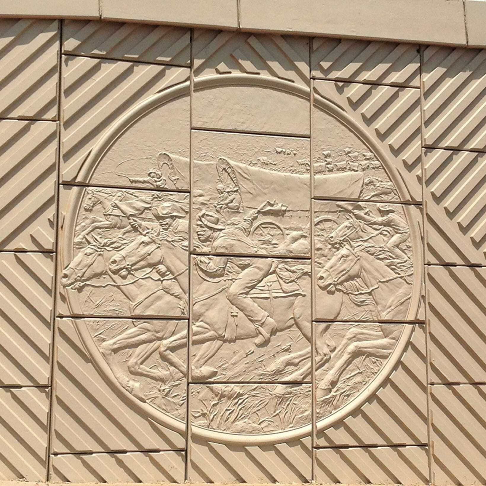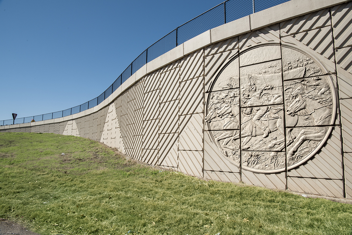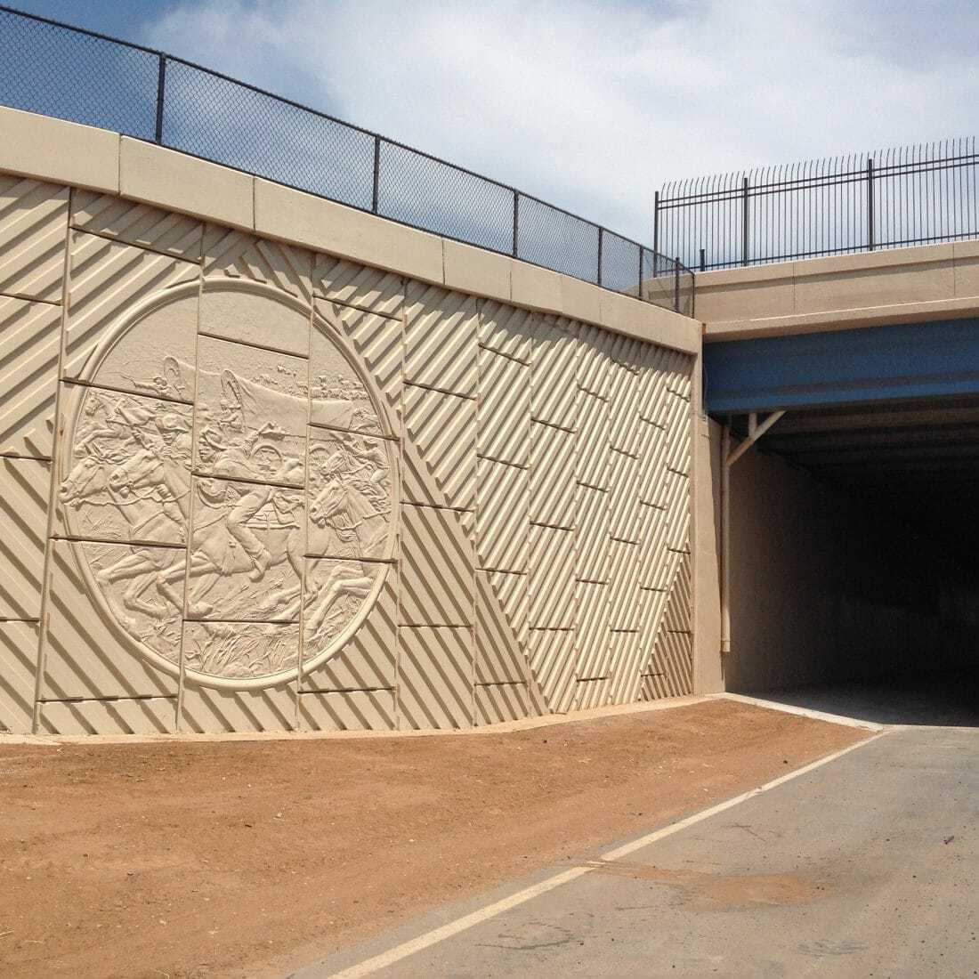Positioned on the MSE walls nearest the bridge are monumental medallions featuring a bas-relief of racing settlers, determined to claim their share of the newly opened Oklahoma Territory. Framing these medallions is an abstract geometric design inspired by aerial views of the furrowed fields of local farms. This pattern continues along the length of the MSE walls and is repeated on the bridge’s bent piers.