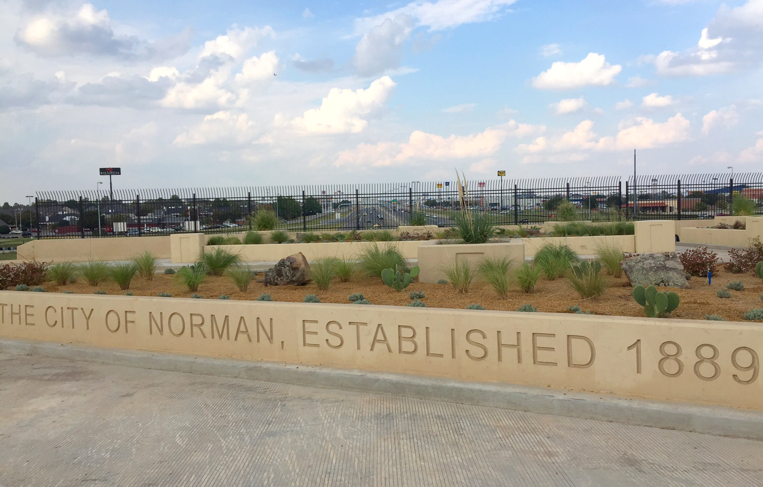 On the bridge deck, Weitzman and his team designed a landscaped pedestrian facility and respite area with cast-concrete seating and planter beds. The space features the inscription: “We belong to the land,” from Oscar Hammerstein’s musical Oklahoma!, along with “City of Norman, Established in 1889,” welcoming commuters into downtown Norman.