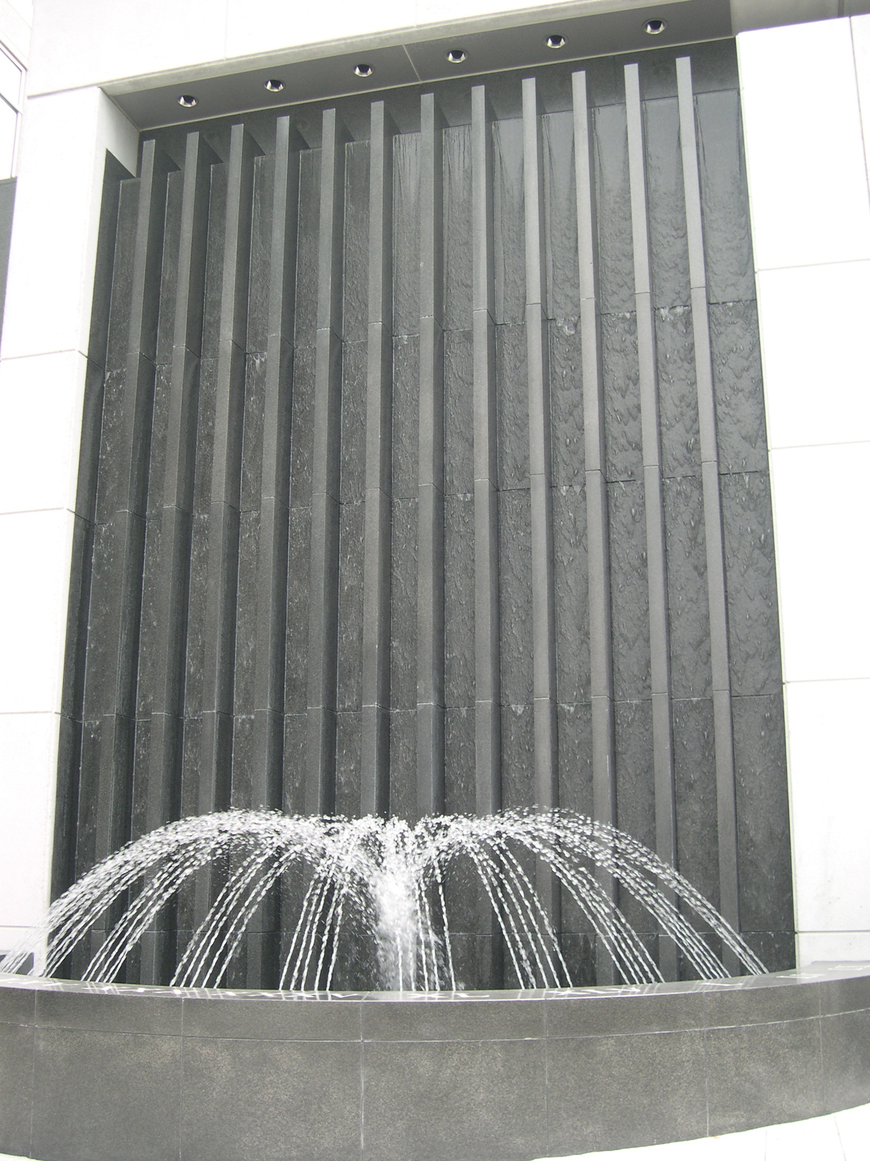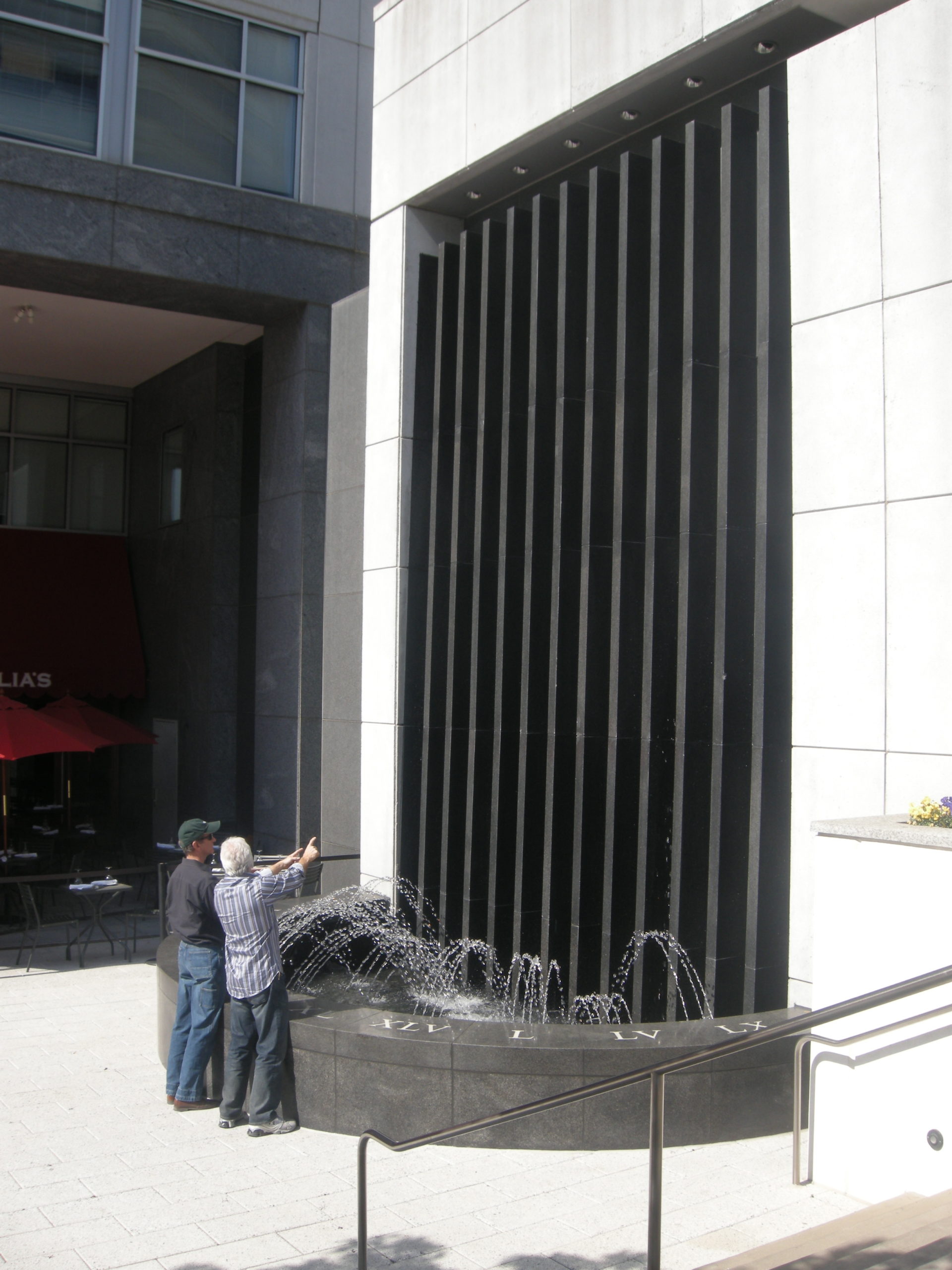 The custom clock fountain conveys time through Roman numerals and a system of vertical and concentric waterspouts that respond to the changing minutes and hours of the day. The celestial sphere features astrological symbols in relief on the outer surface of its central band; on the interior, Roman numerals reveal the time of day through shadows cast by the sun’s rays. Engraved text panels are interspersed throughout adjacent sidewalks, further unifying the space.