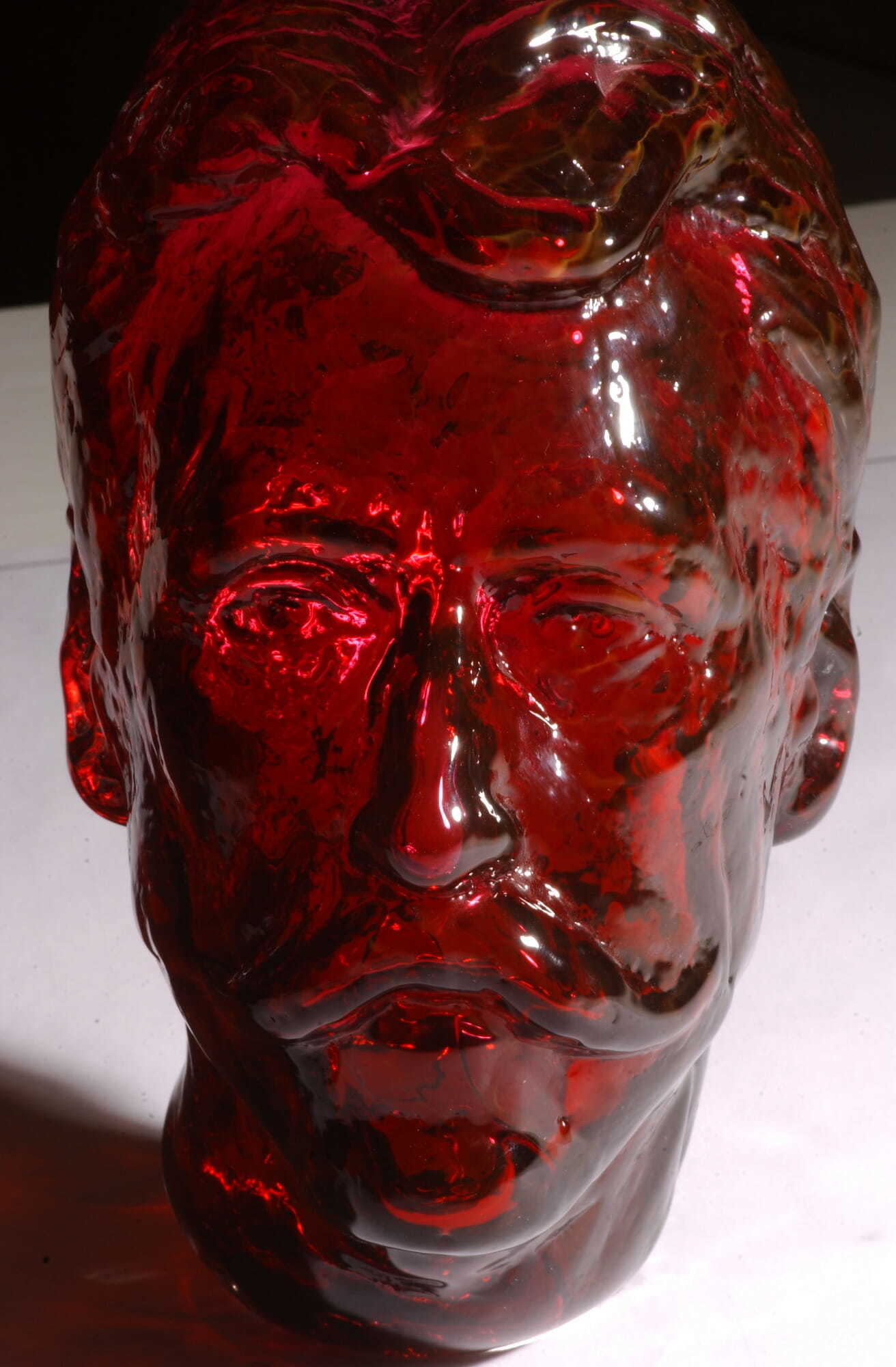 This portrait is crafted from vivid red blown glass.