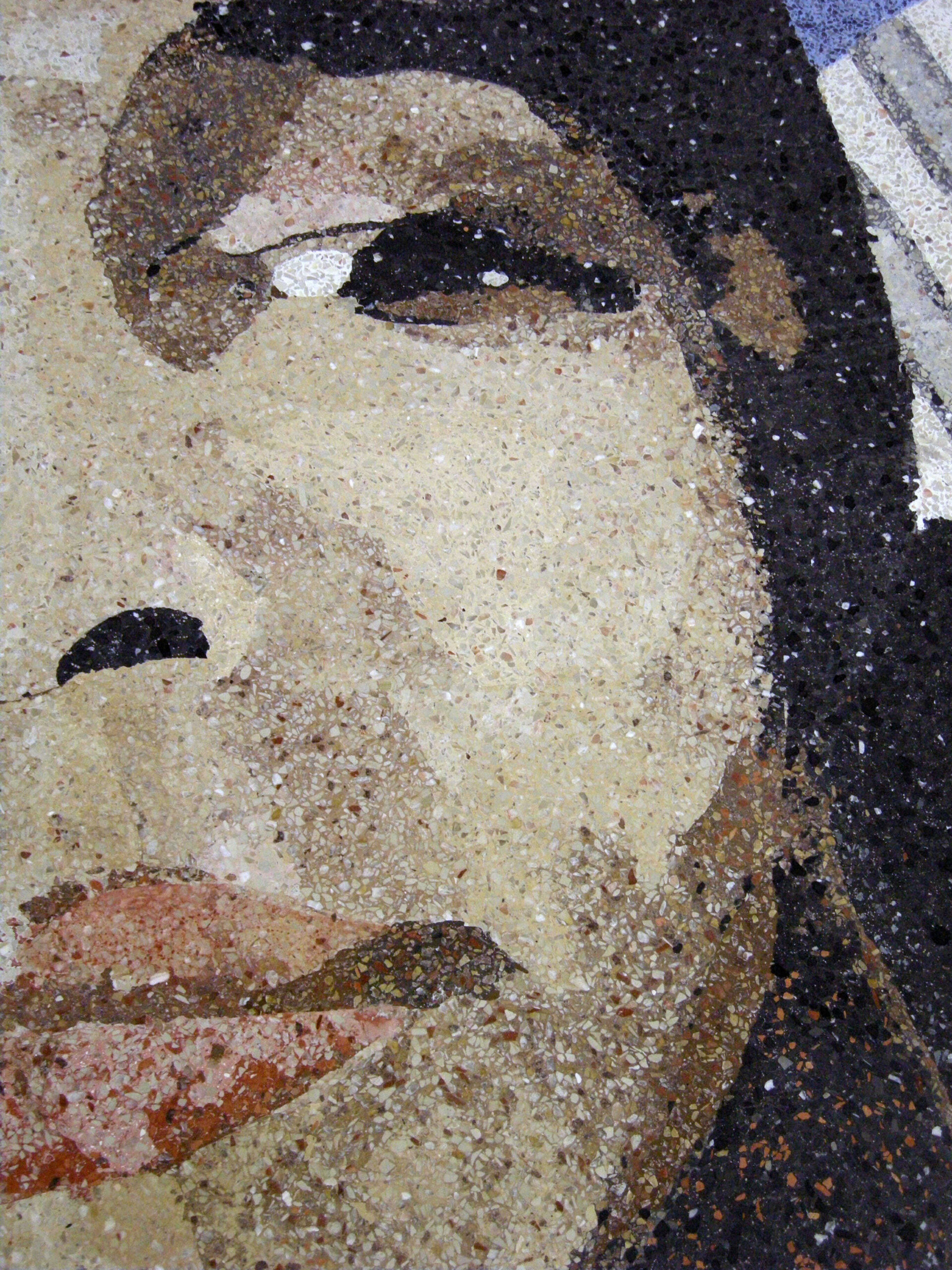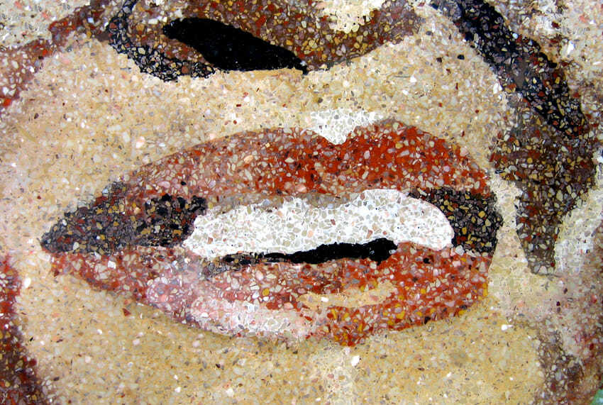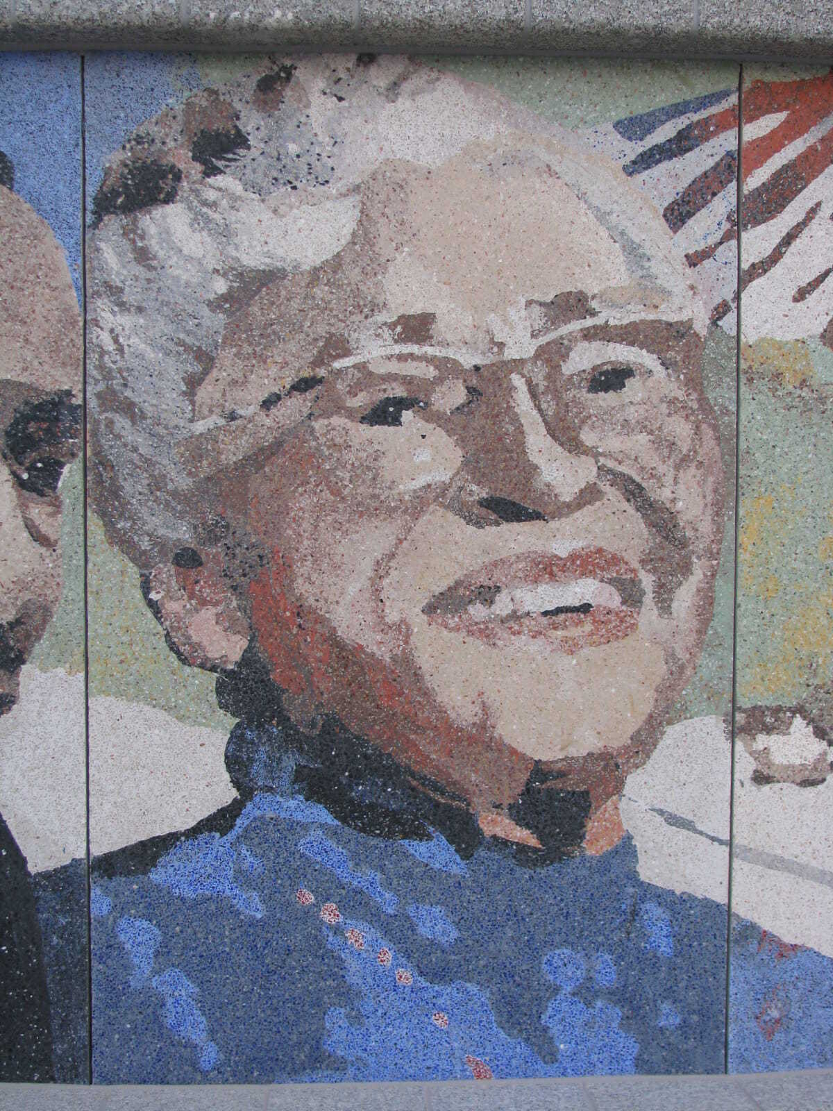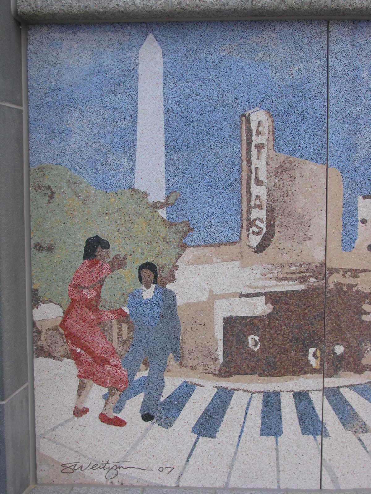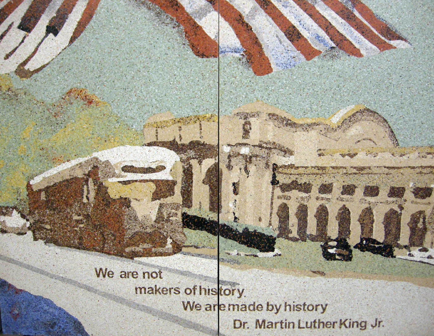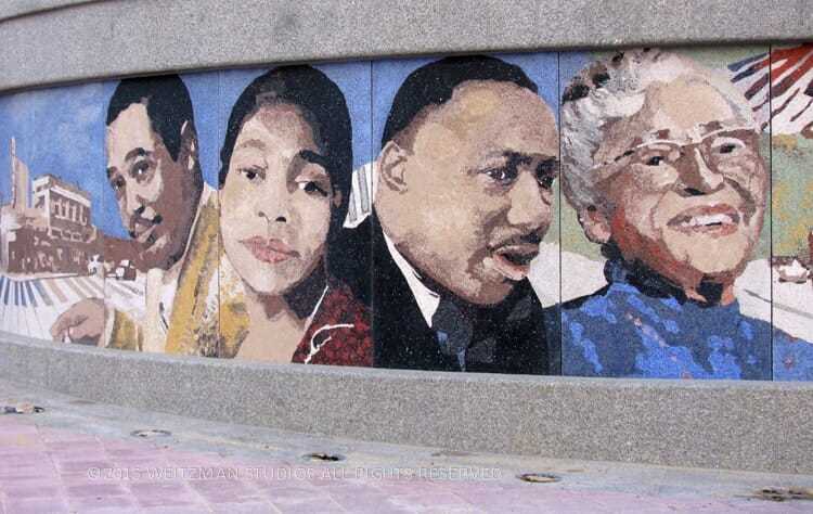 From afar, commuters see the Cornerstones of History mural depicting important activists, artists, and symbols that were instrumental in transforming the social fabric of Northeast Washington D.C. As one approaches the intersection where this FŌTERA® concrete terrazzo public art piece is installed as part of a fountain, the central images sharpen into four monumental portraits honoring Duke Ellington, Bessie Smith, Dr. Martin Luther King, Jr., and Rosa Parks. The curved wall forming the mural makes these central figures appear to burst out of the background. When the water feature is activated, the water flows on either side of the mural, reminding the viewer that these historical figures embody change and renewal.