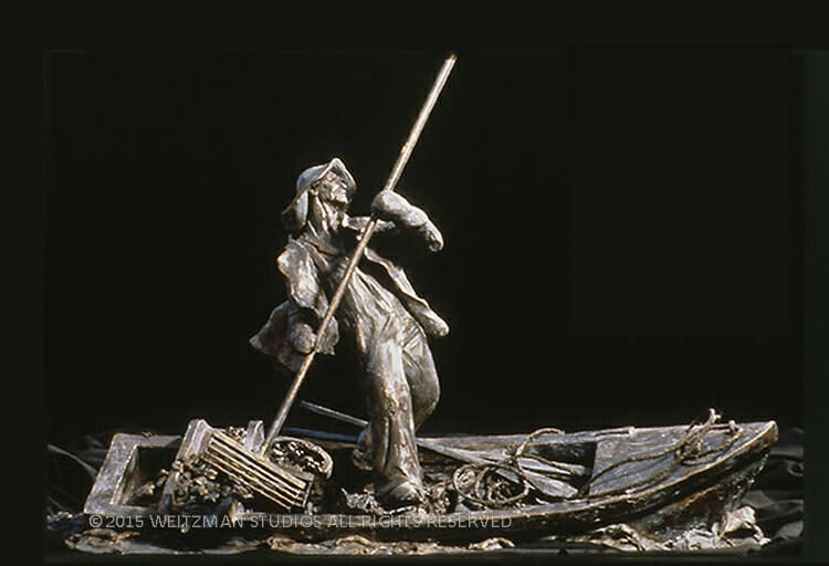 Commissioned by a Chesapeake seaman to honor the local watermen, this custom bronze sculpture depicts a Tonger as he sweeps his tong from the water in the act of gathering oysters. Focusing on the strength of the man as he balances on his cramped and cluttered boat, this sculpture pays tribute to this solitary man and his work.