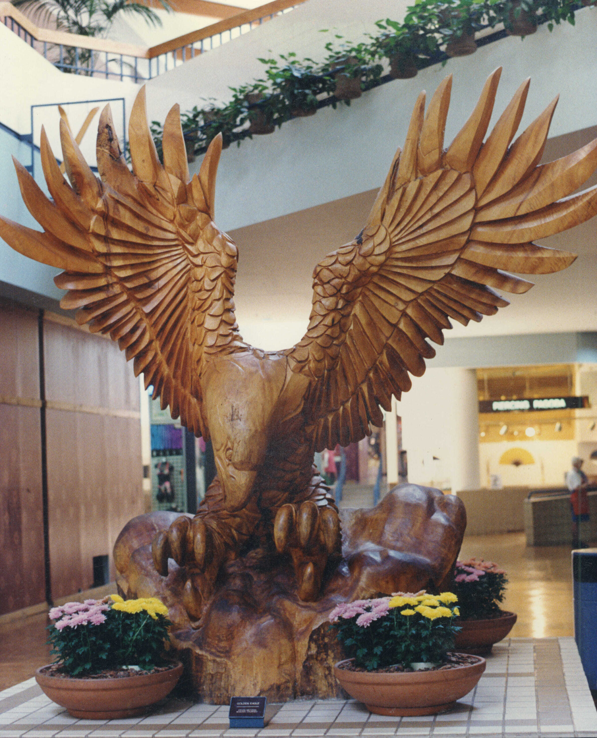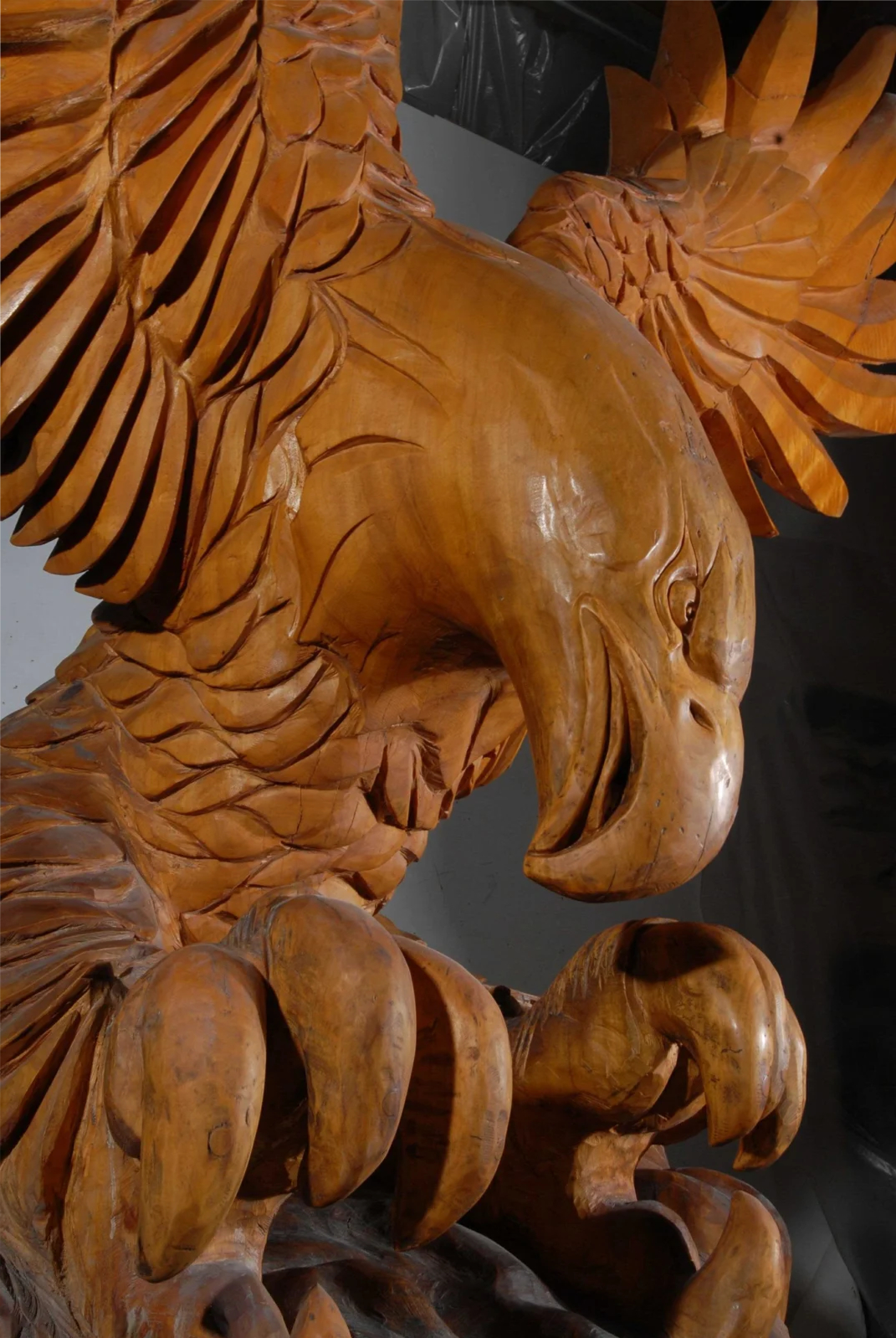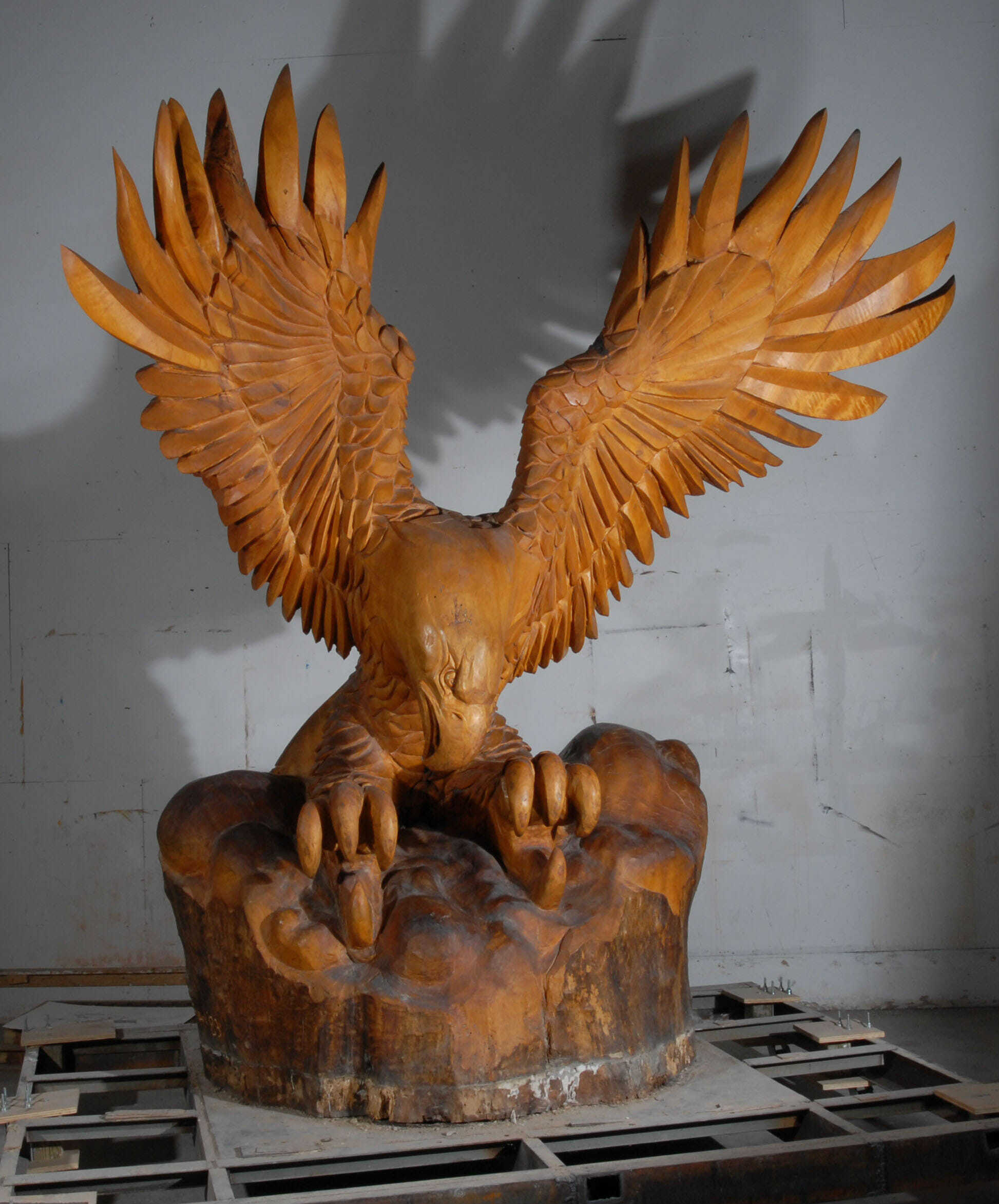 Alighting atop a large cloud, this eagle features a wingspan of 14 feet. It was sculpted from a 9½-ton, 12-foot-high section of cottonwood.